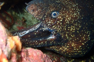 Moray eels is cleaned by Cleaner shrimp.
