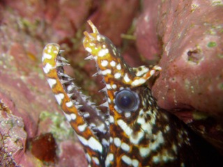 Dragon Moray eel hiding behind the rocks.