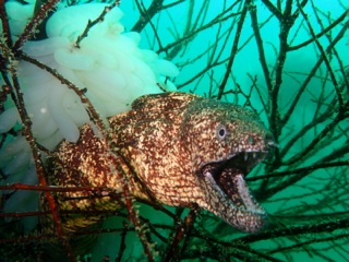 The moray which aims at a squid.